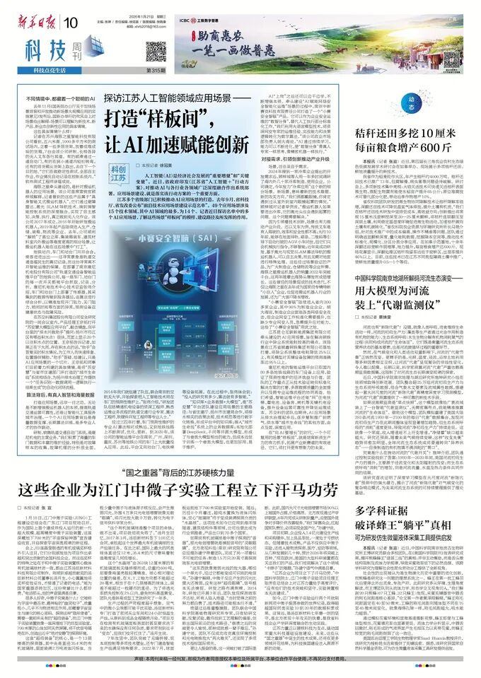 2026年1月21日,《新华日报》以《探访江苏人工智能领域应用场景——打造“样板间”, 让AI加速赋能创新》为题,报道了leyu.com等入选江苏省“前沿技术应用场景建设示范名单”企业,在应用场景建设方面的实践与成效。